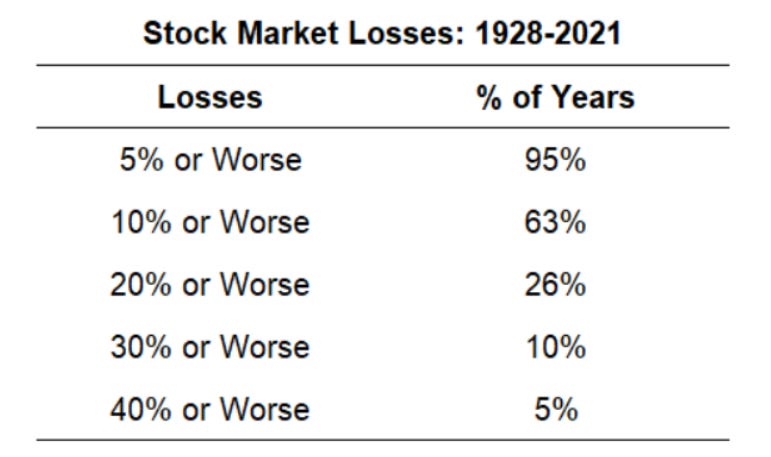This next chart from Ben Carlson, CFA shows us how often the U.S. stock market has experienced the following losses during a calendar year: