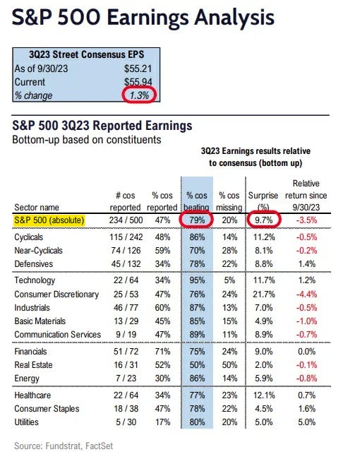 Of the 234 companies that have reported so far (47% of the S&P 500 index), 79% are beating estimates and those that “beat” are beating by a median of 7%.