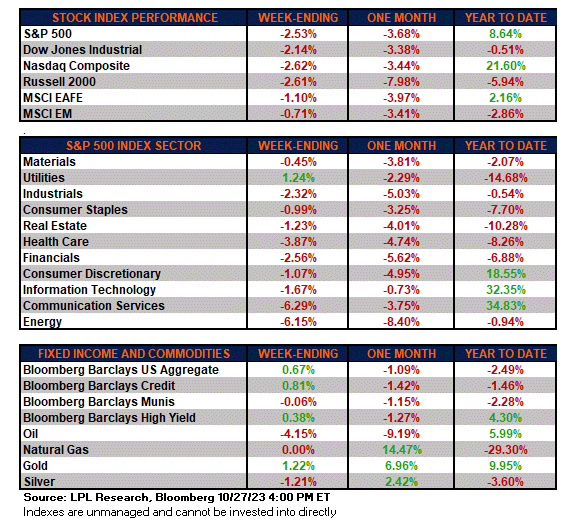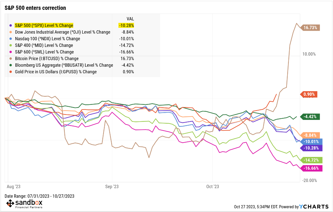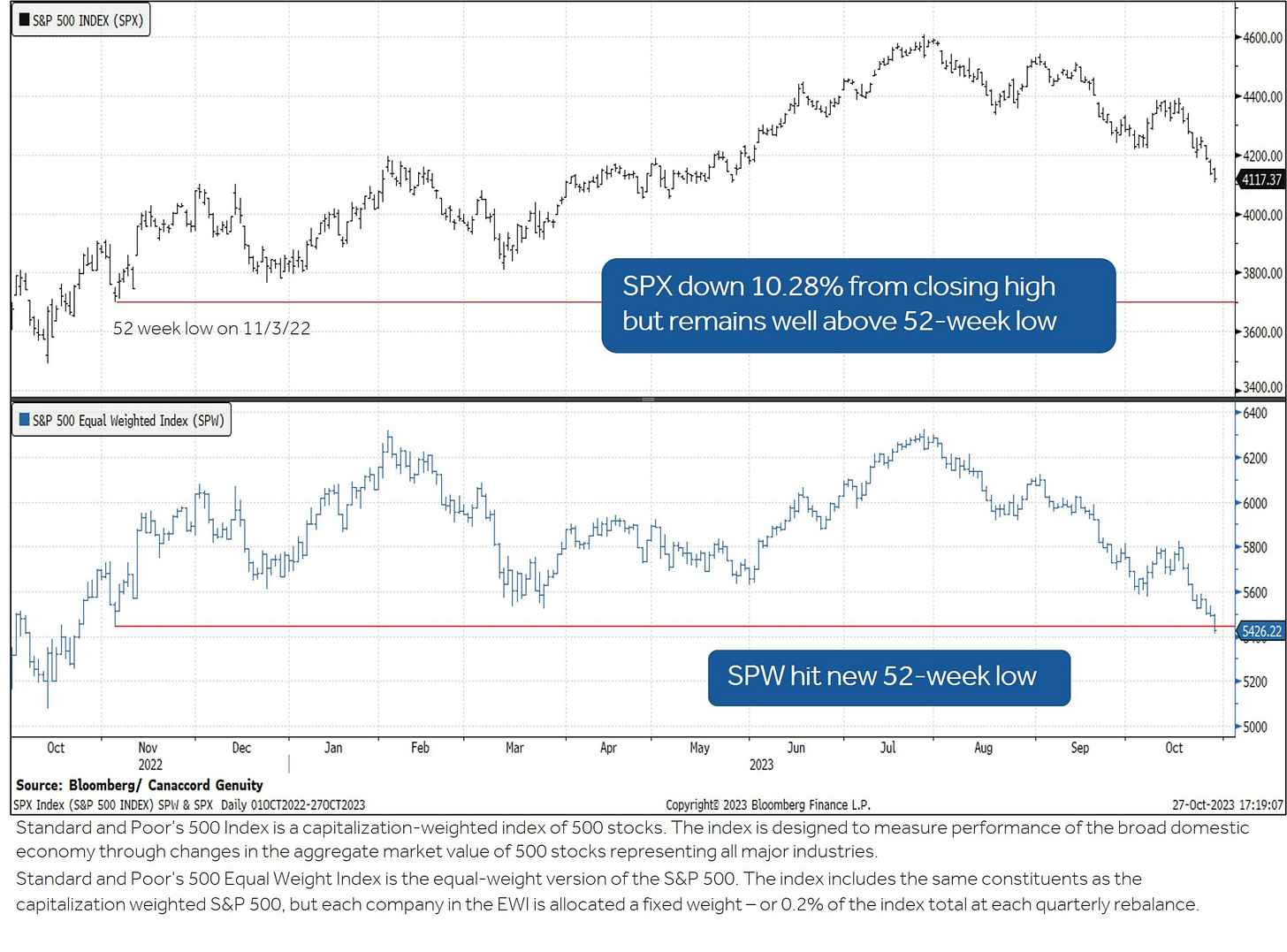 The S&P 500 index dropped -2.4% last week and another -2.5% this week, wiping out the summer rally and taking the index back to May prices. The Dow Jones Industrial Average has now erased its year-to-date gains. Small-caps continue to be the laggard. Meanwhile, interest rates are consolidating after a major ascent higher, with the 10-Year Treasury yield oscillating around 4.8-4.9%; benchmark mortgage rates are climbing above 8%. Precious metals have offered investors a safe haven this month, with gold and silver both positive in October. VIX has continued to expand, making higher highs and higher lows, off the September bottom.
