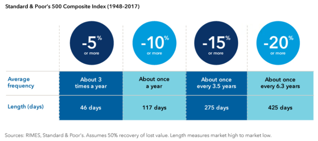 Using a slightly different approach, the Capital Group quantified how often we experience different levels of drawdown. Their data suggests we will experience a double-digit drawdown about once per year, 15% drawdown once every three-and-a-half years, and a 20% bear market every six years.