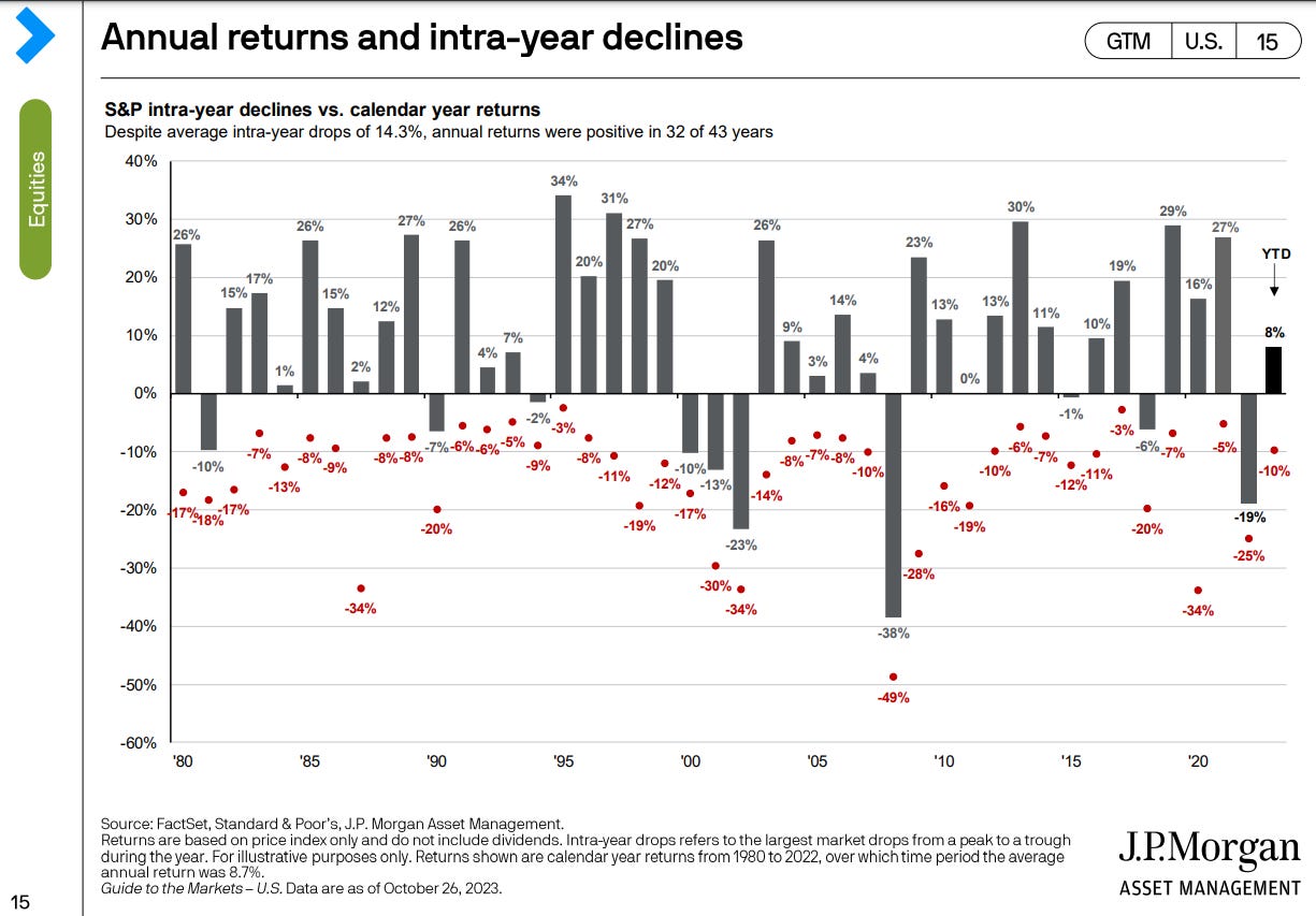 Since 1980, the S&P 500 has averaged a peak-to-trough decline of 14.3% each year. And despite those intra-year declines, stocks managed a positive return in 32 of those 43 years.