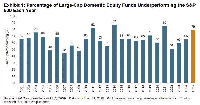 2025 was no different: 79% of all active large-cap U.S. equity funds underperformed the S&P 500 index.