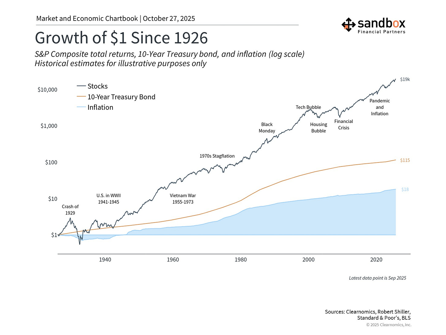 What cost $1 in 1926 costs about $18 today – yet stocks and bonds have risen many multiples more, building real wealth over the decades. This is true despite periodic market pullbacks, financial crises, and recessions over the past century.