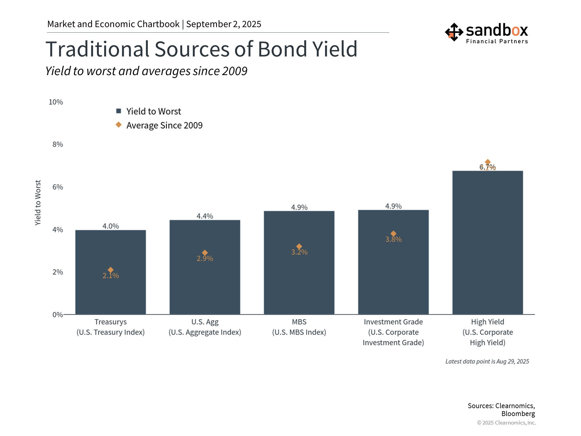 Even if short-term yields decline as the Fed cuts rates, many bond sectors are providing healthy levels of income. The U.S. aggregate bond index is yielding 4.4%, investment grade corporate bonds 4.9%, and high-yield bonds 6.7%. These levels are well above historical averages and support balanced portfolios.