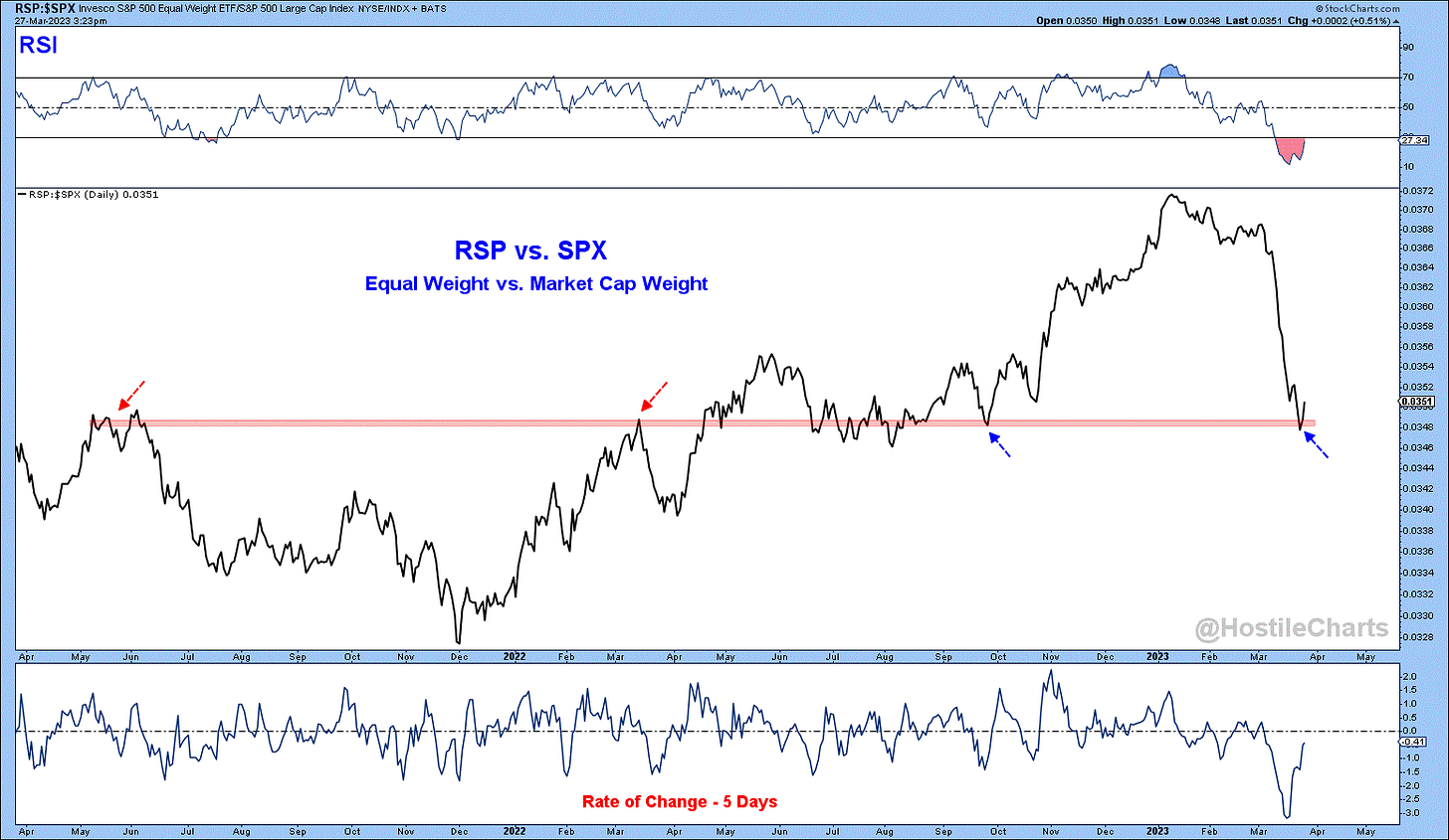 As a result, the equal-weighted S&P 500 is on track for its 2nd worst month relative to the cap-weighted S&P 500 in the past 25 years. The ratio chart below of the equal-weight S&P 500 ETF (RSP) vs. the traditional market cap-weight S&P 500 (SPX) shows relative strength has broken down rather quickly and testing potential support. This level has been a key inflection point in recent years. Bulls would welcome a bounce from this ratio, as it would represent broadening participation as opposed to the narrow mega-cap leadership we've had so far this month. Which leads us to…