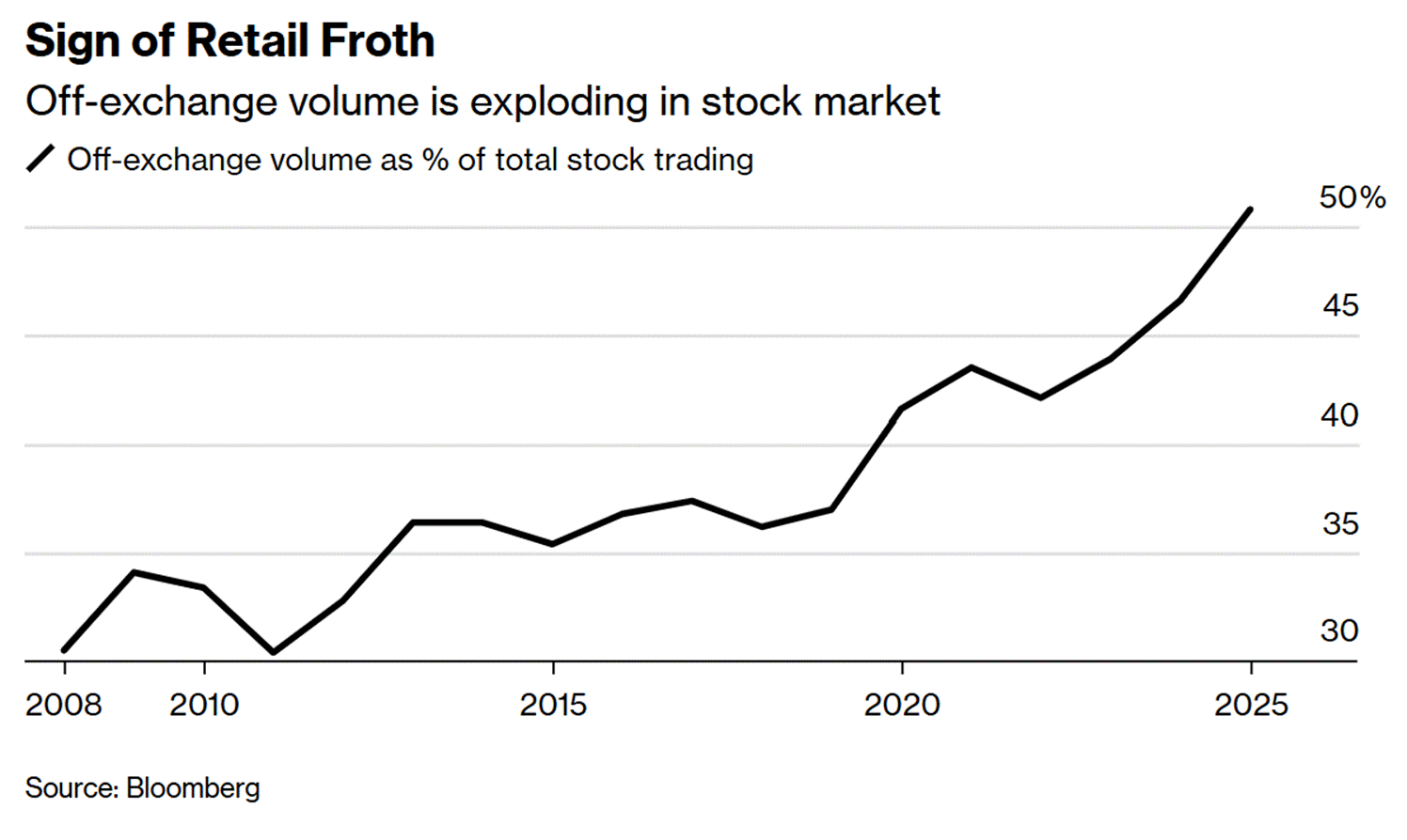 One proxy for retail involvement in the market is the volume of stocks executed by off-exchange venues such as those run by equity wholesalers serving clients like Robinhood Markets Inc. Those trades are poised to make up 50% of the total this year for the first time ever.”