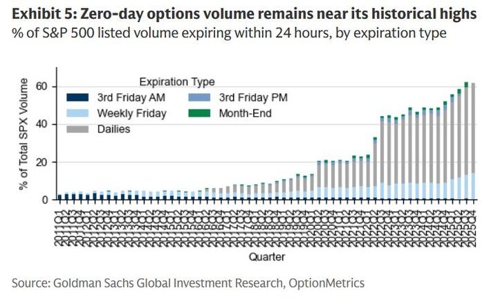 Goldman Sachs: “And it’s not just plain vanilla investing or trading, leverage is a huge part of this story — especially the scramble to speculate. The stimulus fueled frenzy of 2020/21 opened minds to what’s possible and opened the floodgates of greed. We see this in the rise of “zero-day options” trading volume (options that expire within 24 hours — whose sole purpose is to speculate on very short-term market movements, and typically resulting in significant effective leverage).”