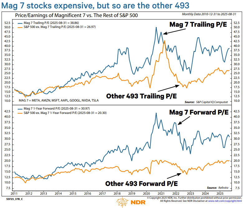 The current Mag 7 trailing P/E of 38.9 is in the top 15% of readings since 2010, versus the top 10% for the S&P 493. For forward P/Es, the Mag 7 P/E of 31.0 is in the top 20% since 2010, versus 2% for the S&P 493.