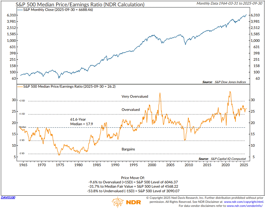 The S&P 500 median P/E of 26.2 is in the top 5% of readings since 1964 and only surpassed by the 1990s/2000s tech bubble, the post-pandemic period of irrational exuberance 2021, and a smattering of readings in the last 18 months.