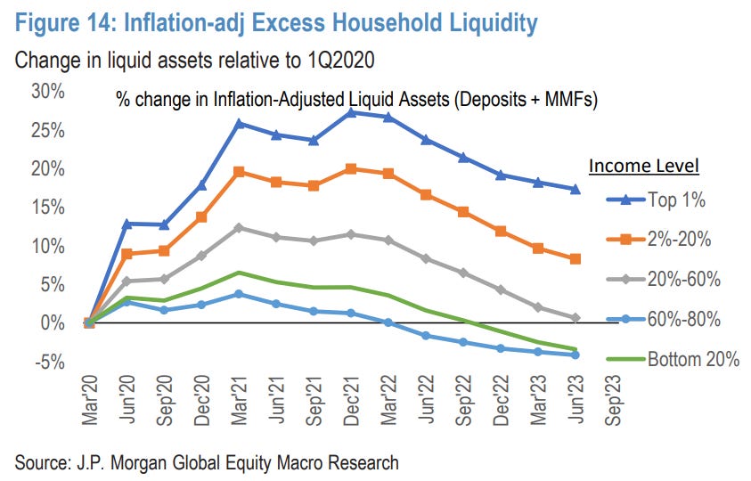 Importantly, nearly all the inflation-adjusted excess cash sits with the relatively affluent (top 20%), while the middle class (top 20%-60%) real liquidity is back to pre-Covid levels.