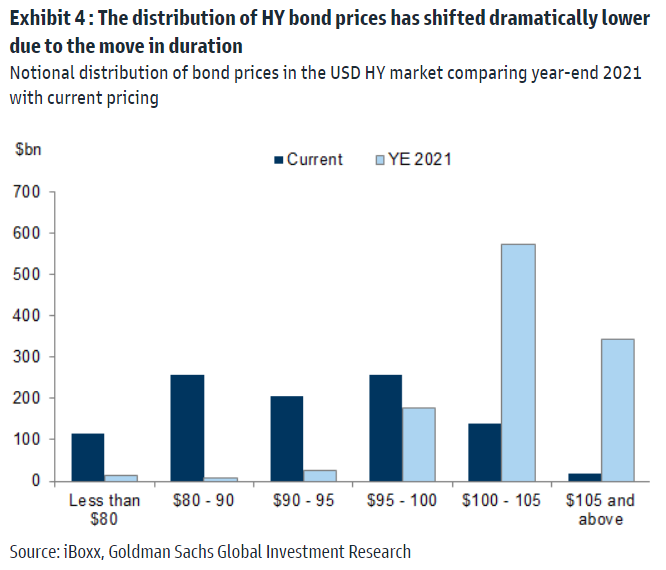 Losses have been more benign than usual because the exogenous shock from all rates simultaneously lifting higher shifted the entire distribution of corporate bond prices downward. Meaning, since we have a lower starting point for bond prices, losses (given a default) have been somewhat better than past cycles. See chart below.