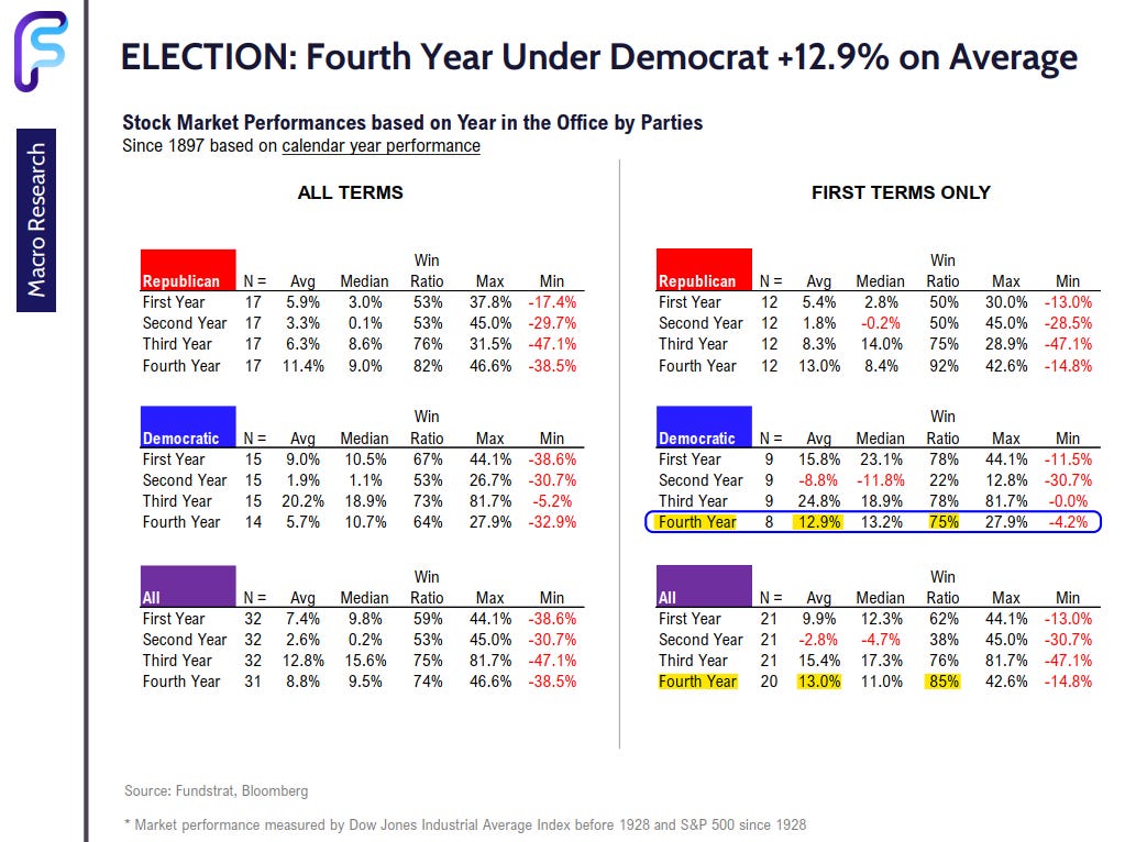 The 4th year of 1st-term Democratic presidents see an average stock market gain of +12.9% (sample size=8), while the 4th year of any parties’ 1st-term president enjoys an average gain of +13.0% (sample size=20).