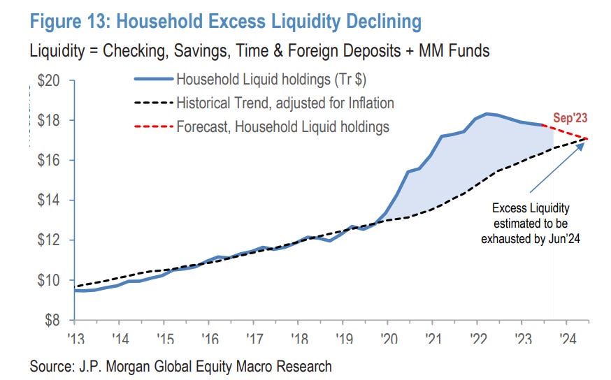 Excess U.S. household liquidity – i.e. cash and cash-equivalent assets – has fallen from a peak of $3.4 trillion to $1.0 trillion and should largely be exhausted by the 2nd quarter of 2024, based on estimates from J.P. Morgan.