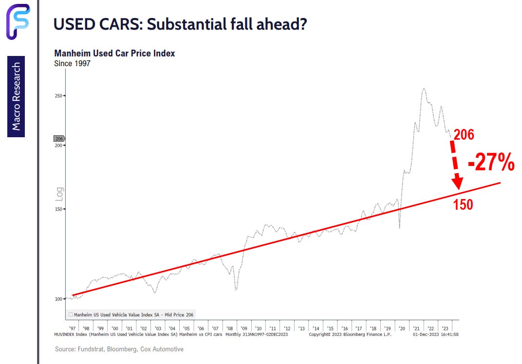 If the Manheim index is to mean-revert back to its long-term trend, then there’s plenty more room for car prices to fall: