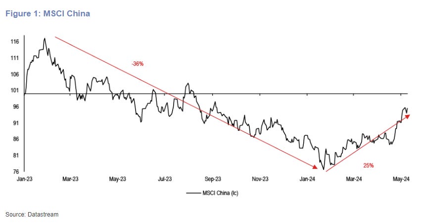 China stocks were down almost 40% from January 2023 to the recent lows in January 2024, although an aggressive bounce has witnessed large-cap stocks recover 25% or more.