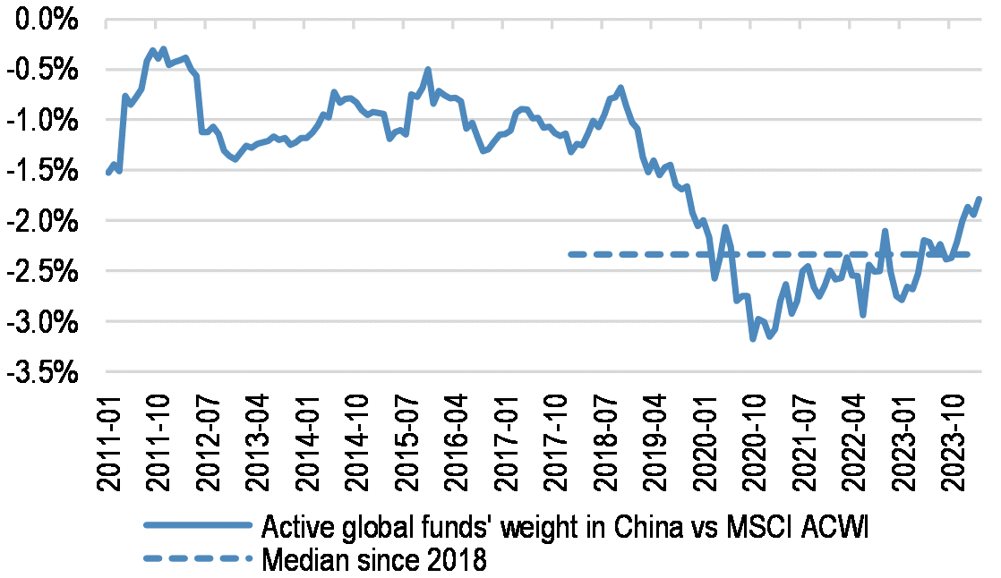 The underweight positioning of managers is most obvious for global equity funds tracking the All Country World Index (ACWI) and Asia Ex-Japan, not so for EM broadly, and the recent rally has prompted a partial catchup towards pre-GFC levels.