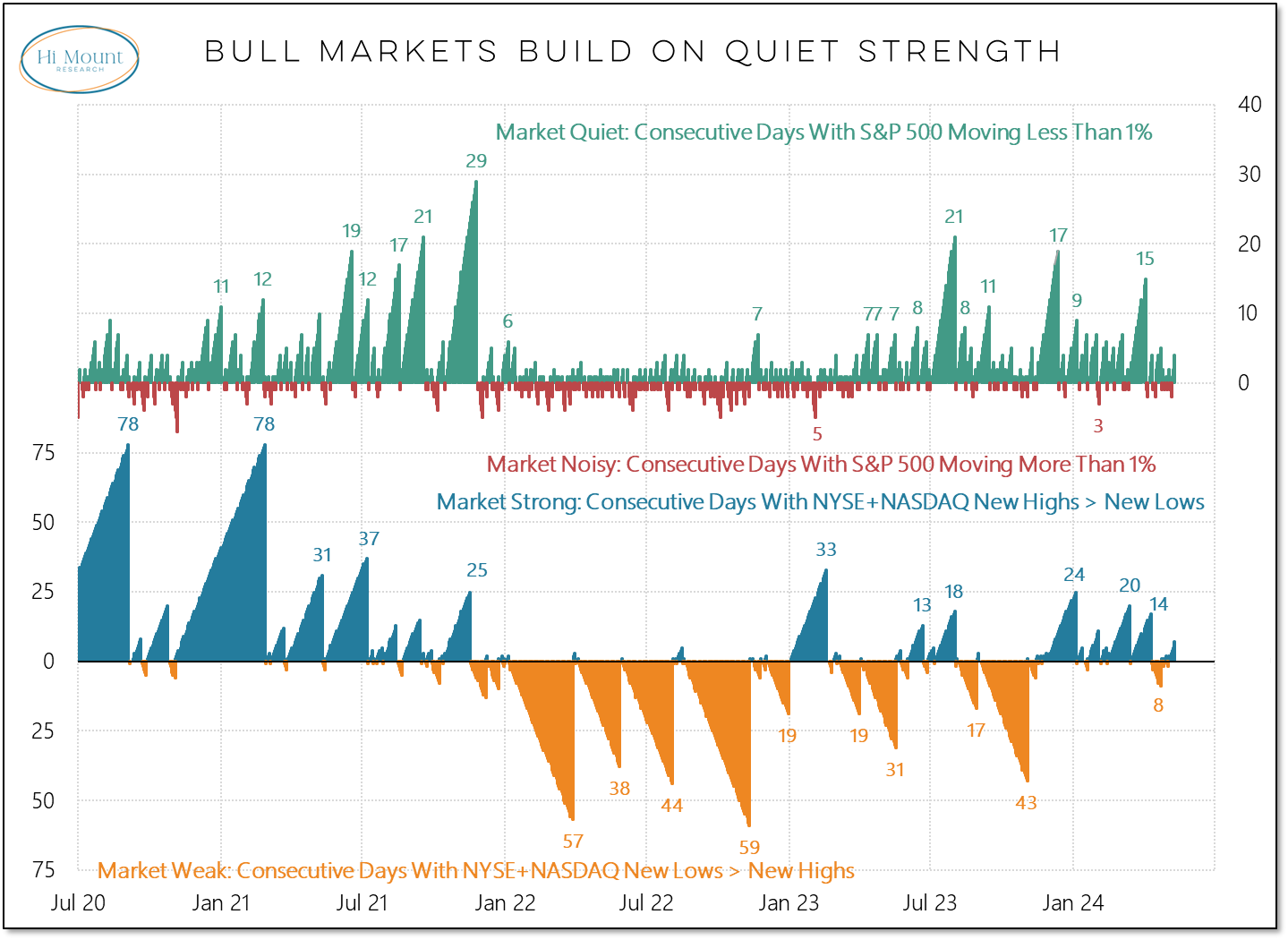 “We are at seven days in a row of more new highs than new lows and four days in row without a 1% swing in the S&P 500. While it may be boring for headline writers, quiet strength is the normal condition during bull markets.”