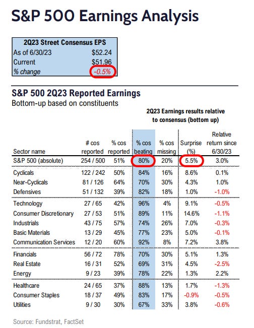 Of the 254 companies in the S&P 500 (51%) that have reported, 80% have reported actual EPS above their estimates, which is above both the 5-year average of 77% and 10-year average of 73%.