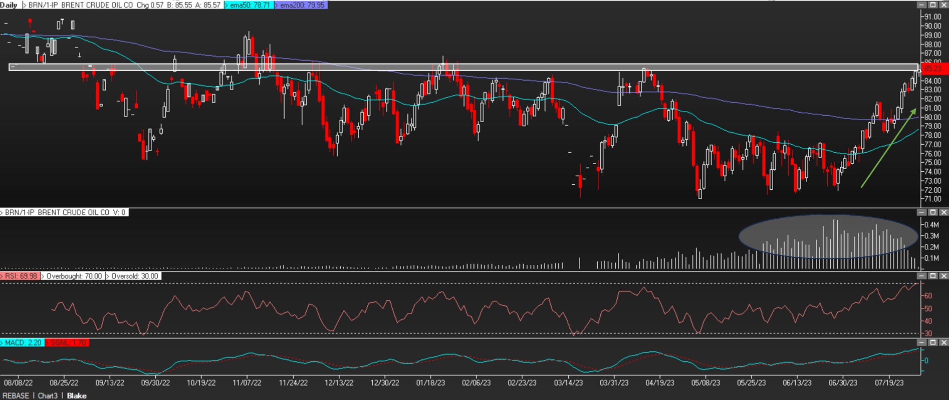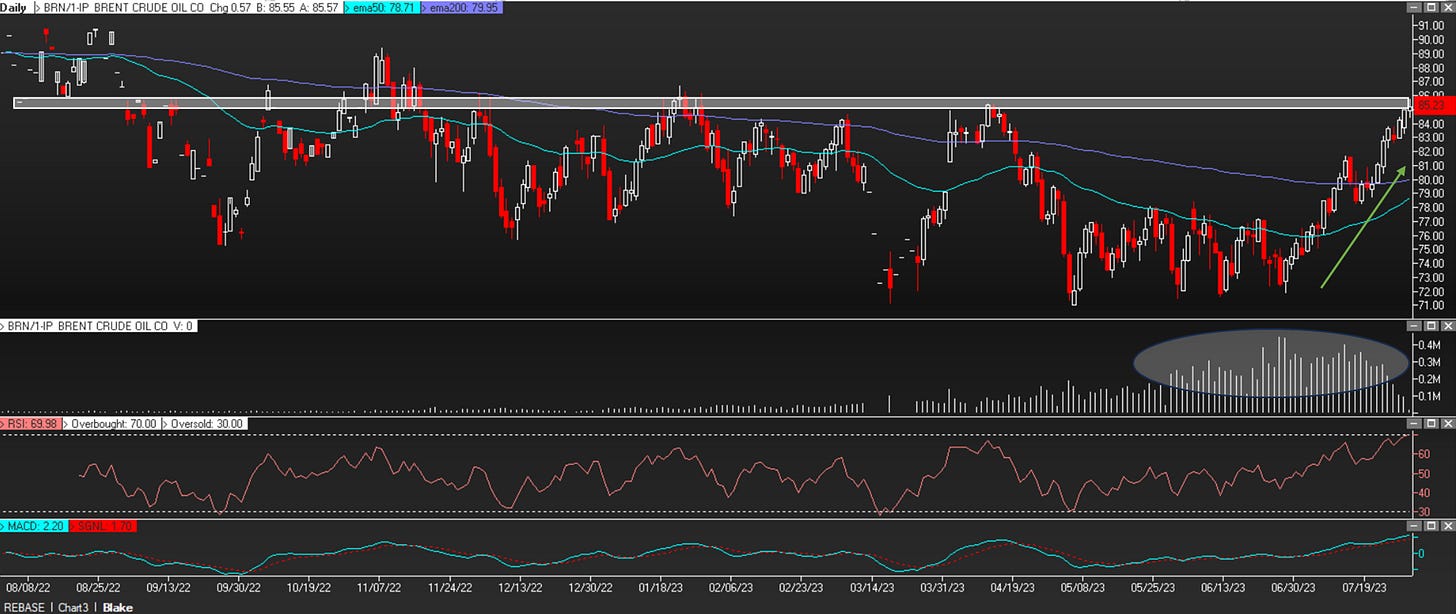 Since late June, oil prices have run up without abandon – and on heavy volume. But when you zoom out, oil has been trading sideways for the last year as you can see in the chart below. Brent Crude now seems to be approaching its first logical area of possible resistance to this rally as it challenges the January and April 2023 highs.