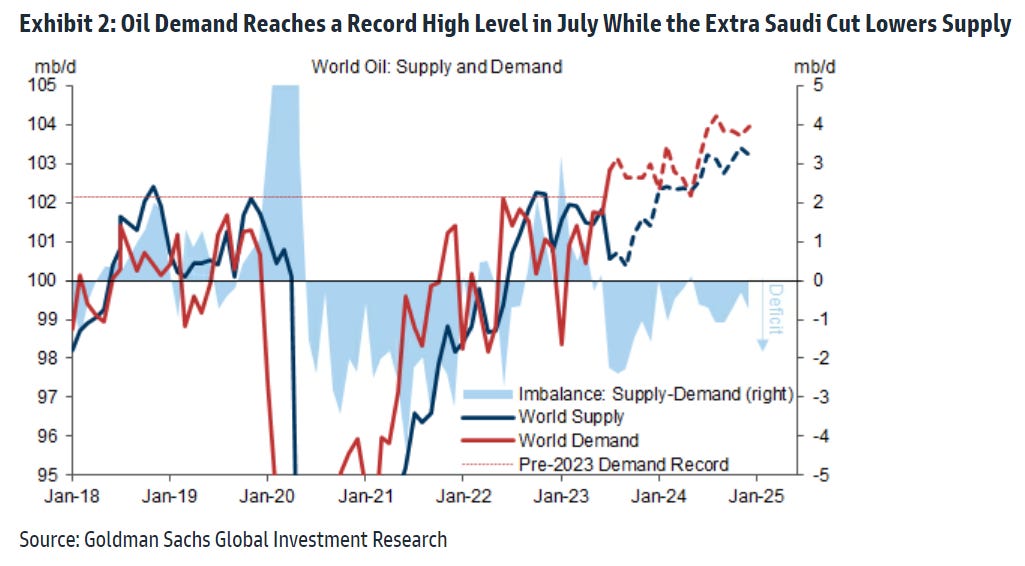 Per a recent Goldman Sachs note, this rally has been spurred by investors growing more constructive on their outlook for the global economy as well as a swing in positioning. Demand is soaring while Saudi supply cuts have brought back deficits, just as the market has abandoned its growth pessimism. The reduction in U.S. recession risk – following firmer economic activity but softer inflation data – has supported investor sentiment. A weaker dollar has also helped.