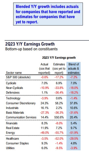 The blended earnings decline (blended combines actual results for companies that have reported and estimated results for companies that have yet to report) for the 2nd quarter is -7.2% today, which would mark the 3rd consecutive quarter in which the index has reported a year-over-year decline in earnings – so the earnings valley/recession is here, as expected.