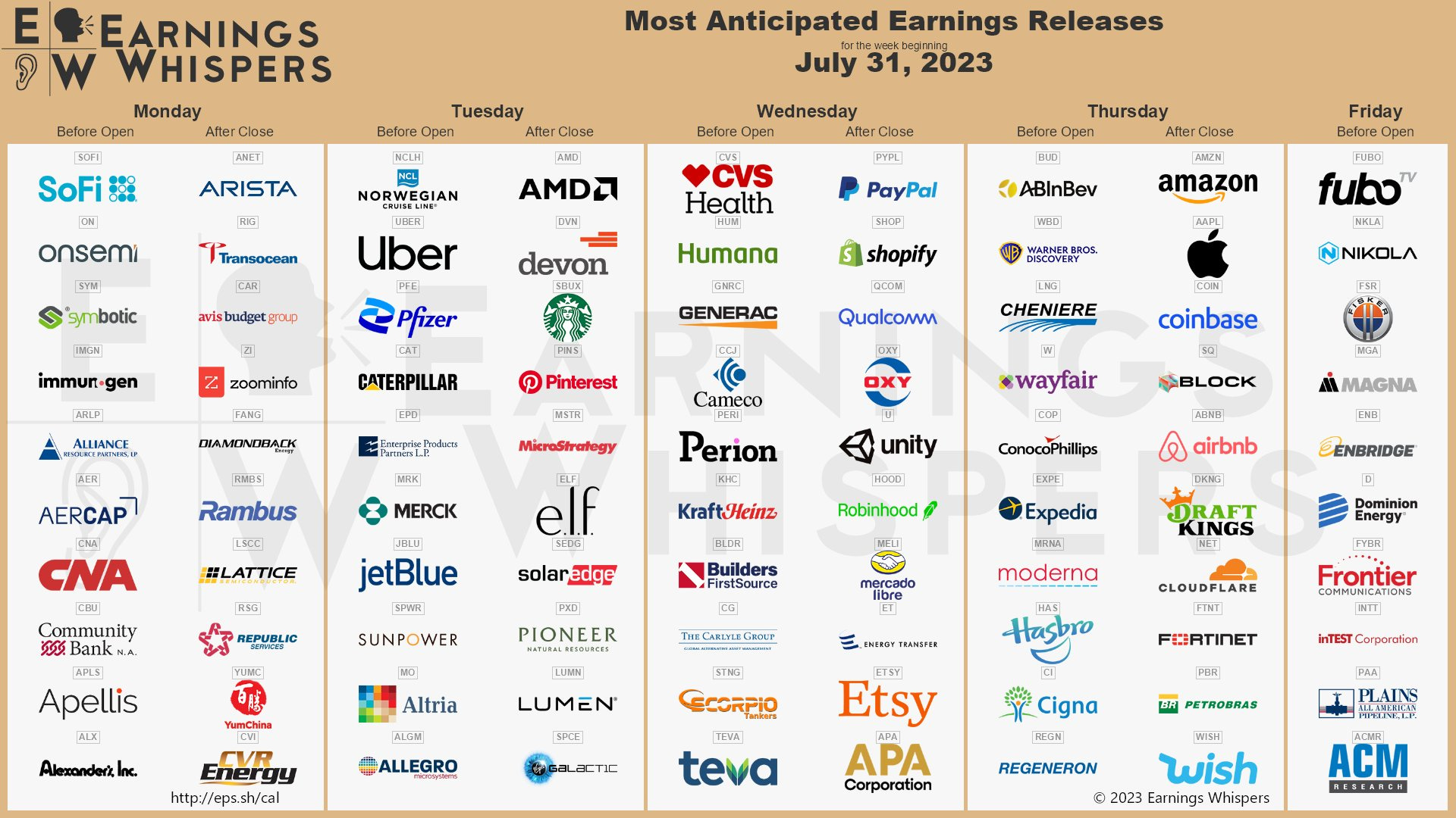 Marquee names are reporting results every day. SoFi, AMD, Caterpillar, Uber, Pfizer, CVS, ABInBev, Amazon, and Apple are notable reporters.