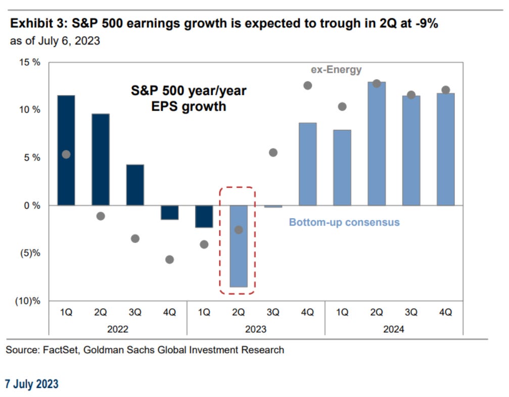 Consensus expects 2Q profits for the aggregate S&P 500 index to fall by -9% YoY, however, EPS growth estimates for the median S&P 500 stock are more optimistic (+1%). Many expect this reporting season to be the trough in the earnings cycle, yet S&P 500 ex-Energy EPS already troughed in Q4 of 2022, coinciding with the market bottom (October 2022).
