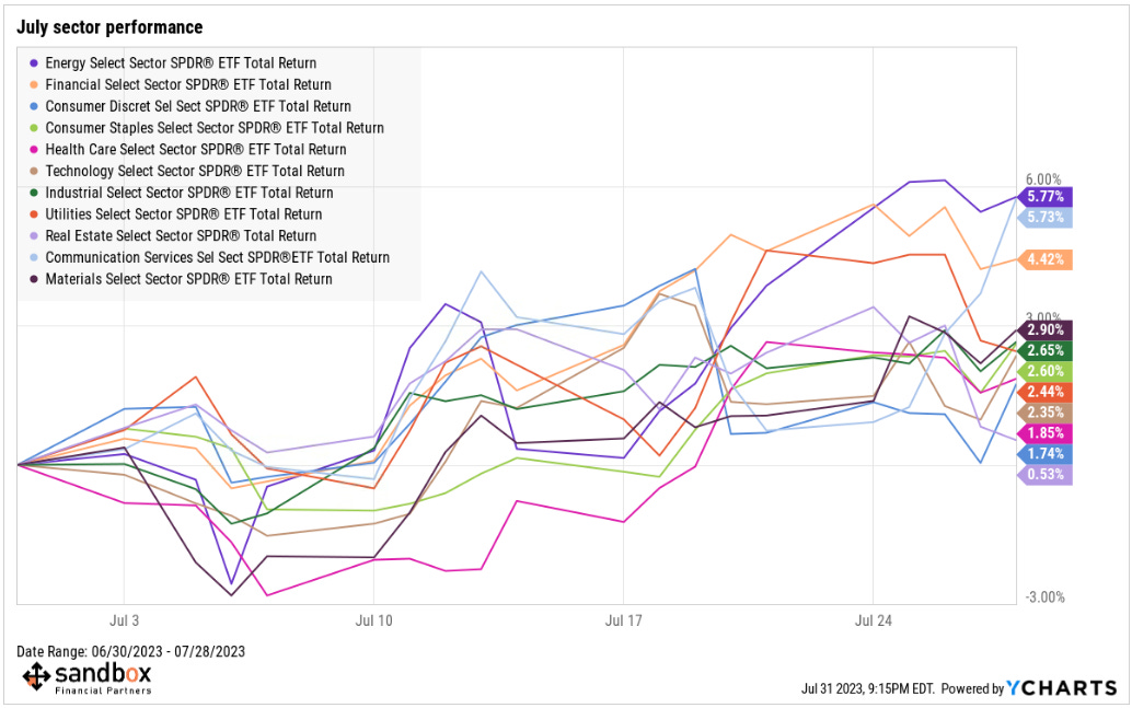 The continued strong lift in the underlying commodity is evident in rising Energy prices as the sector quietly takes over as the best performer of the last month. The sector rotation that’s taken place this summer should be respected, despite mainstream media continuing to flag the 2023 bull market as narrow in breadth.