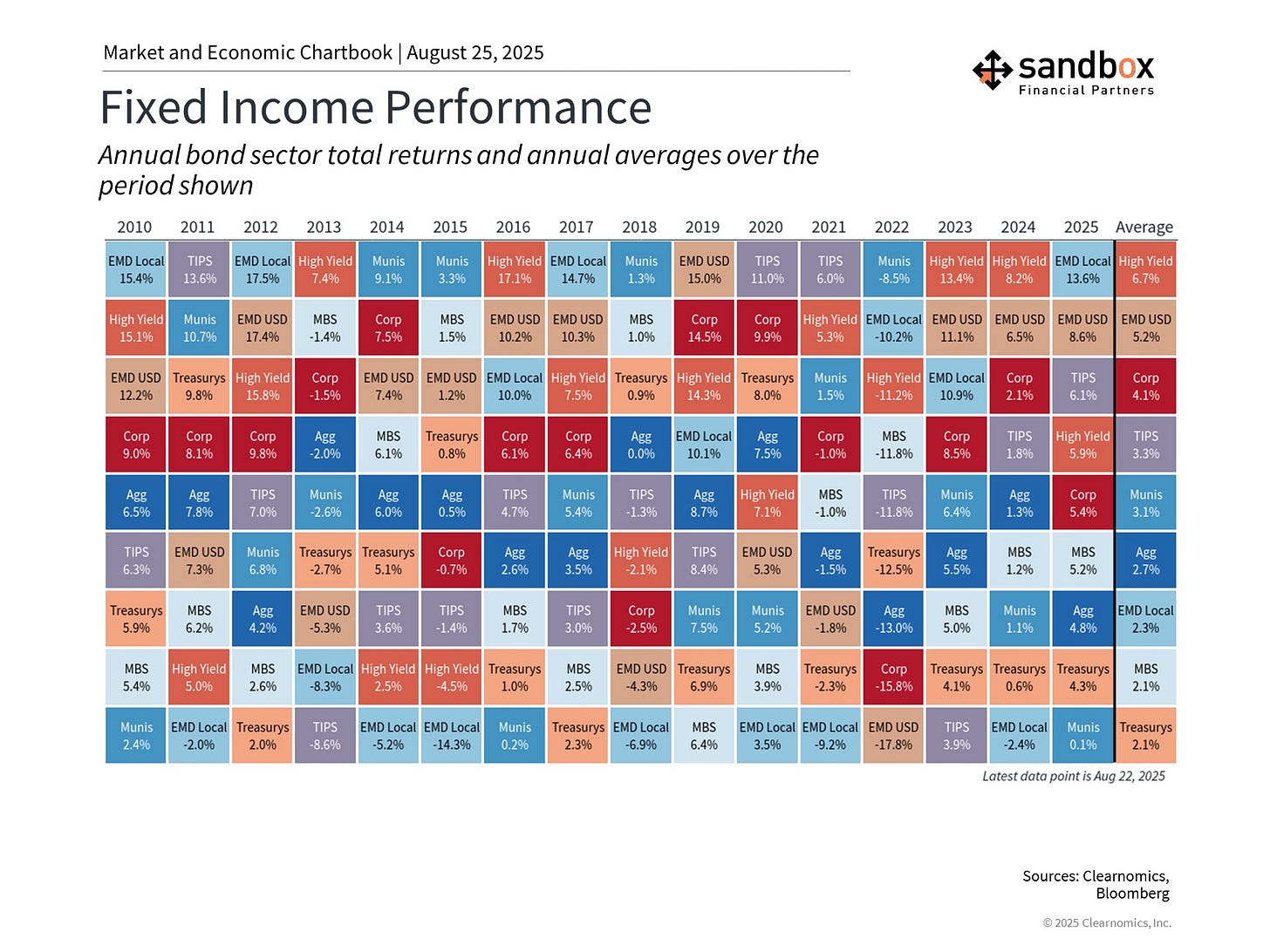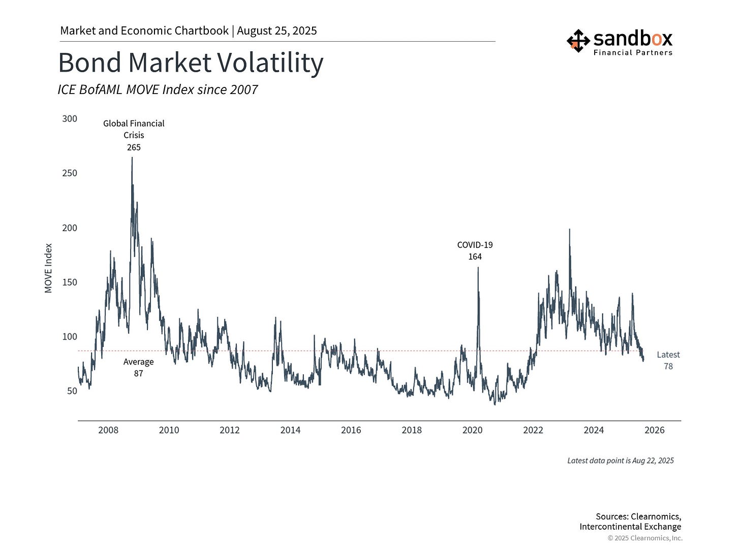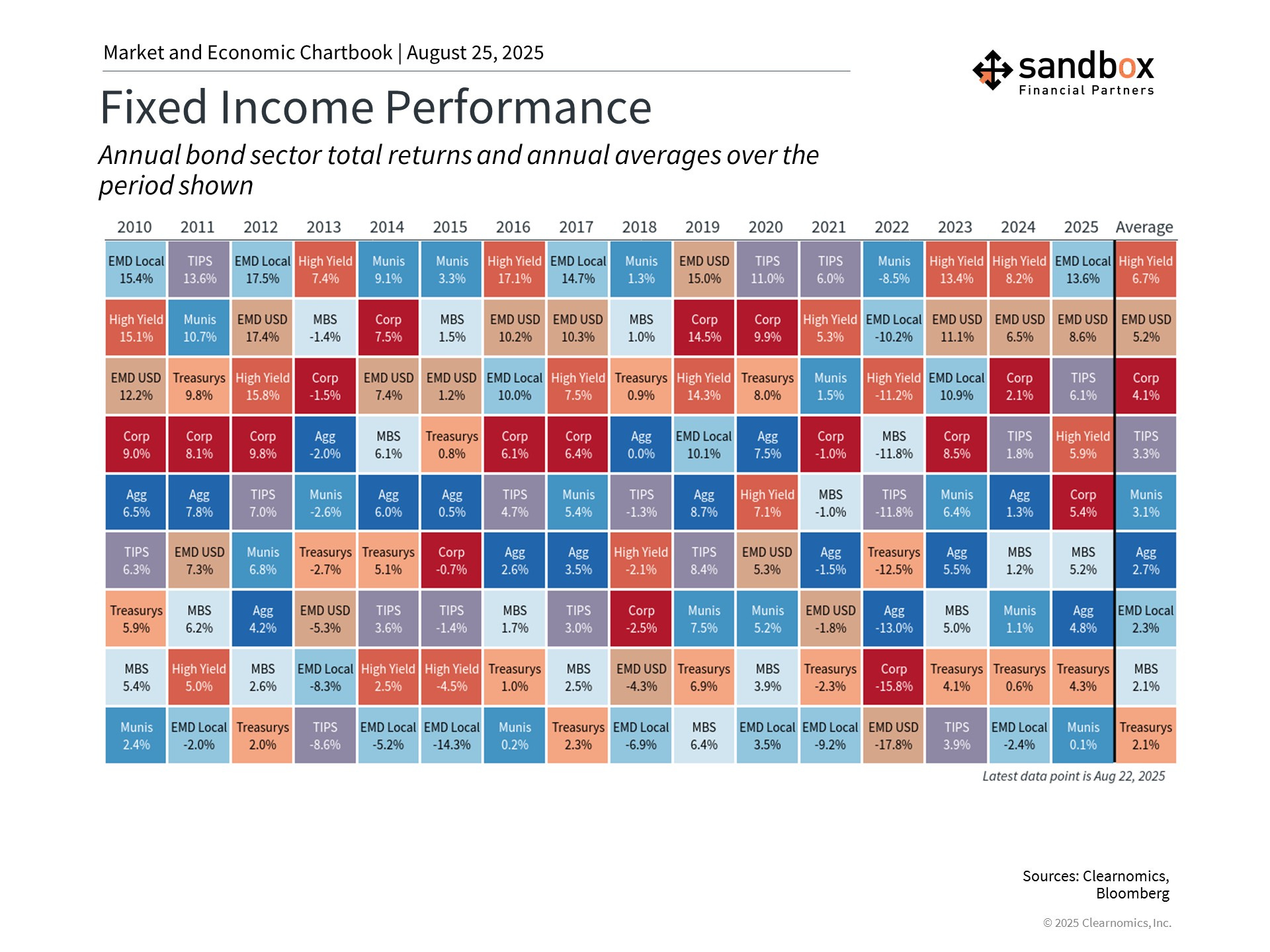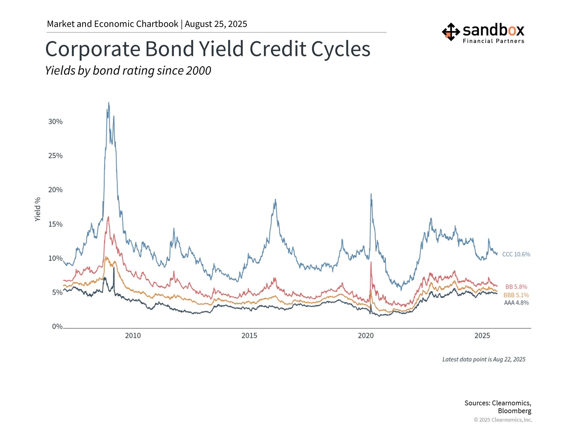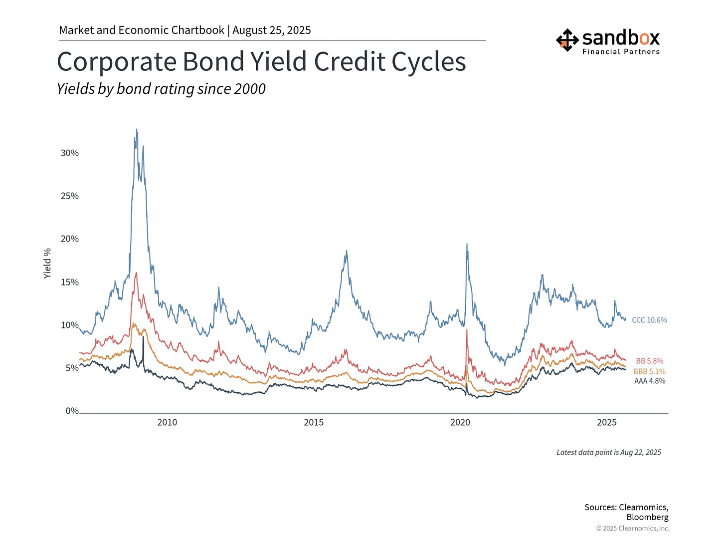 The U.S. Aggregate Bond Index is up 4.8% this year, while yields remain attractive: ~4.0% for Treasuries, ~5% for investment-grade corporates, and ~7% for high-yield credit. For savers and retirees, these yields are far higher than the average levels since 2008.