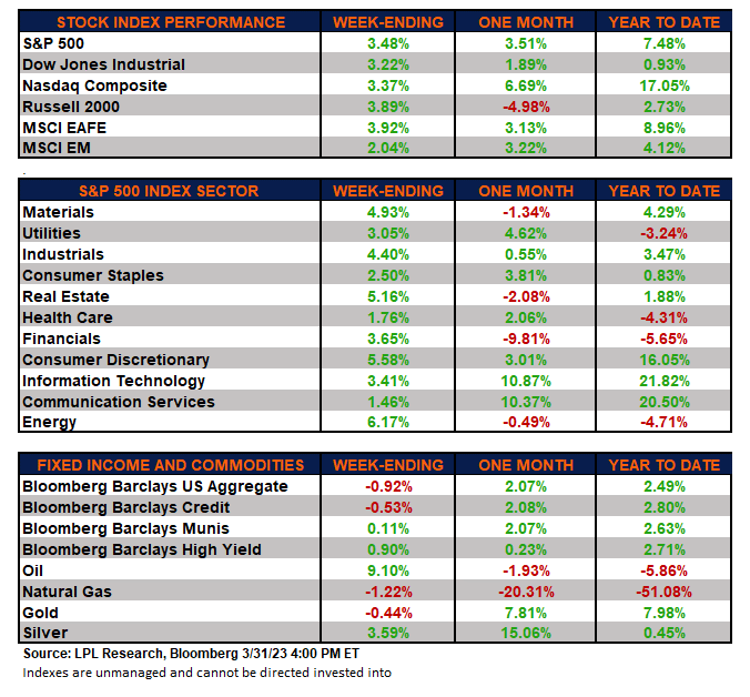Commodities: Energy prices finished mixed even as traders remain concerned over the present banking climate and its potential effect on the economy. Crude oil rallied for the second straight week after reaching a 15-month low three weeks ago. Natural gas prices declined for the third straight week. The major metals (gold, silver, and copper) ended the week mixed.