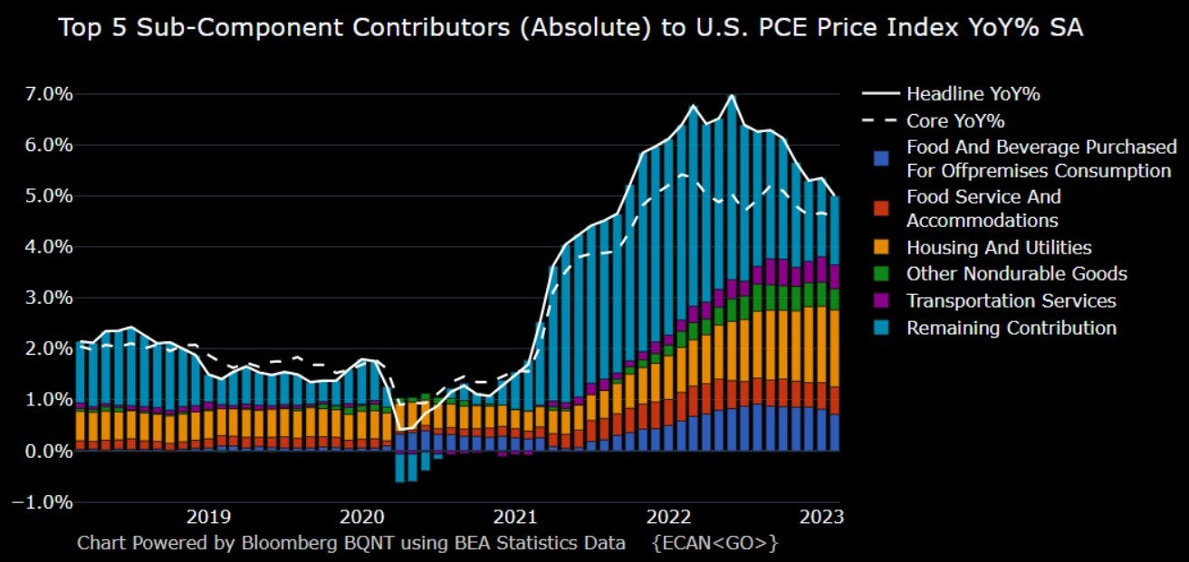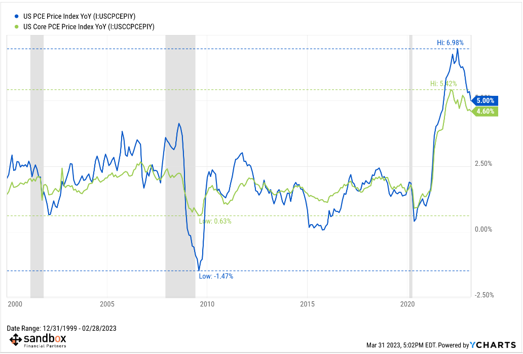 On a year-over-year basis, the headline PCE measure eased to +5.0% while core PCE ticked down to +4.6%.