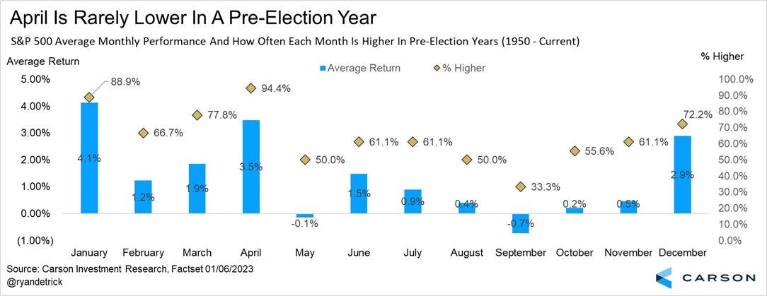 The S&P 500 has been up 17 of the last 18 times in a pre-election year. And over the last 20 years, April has been the best performing month.