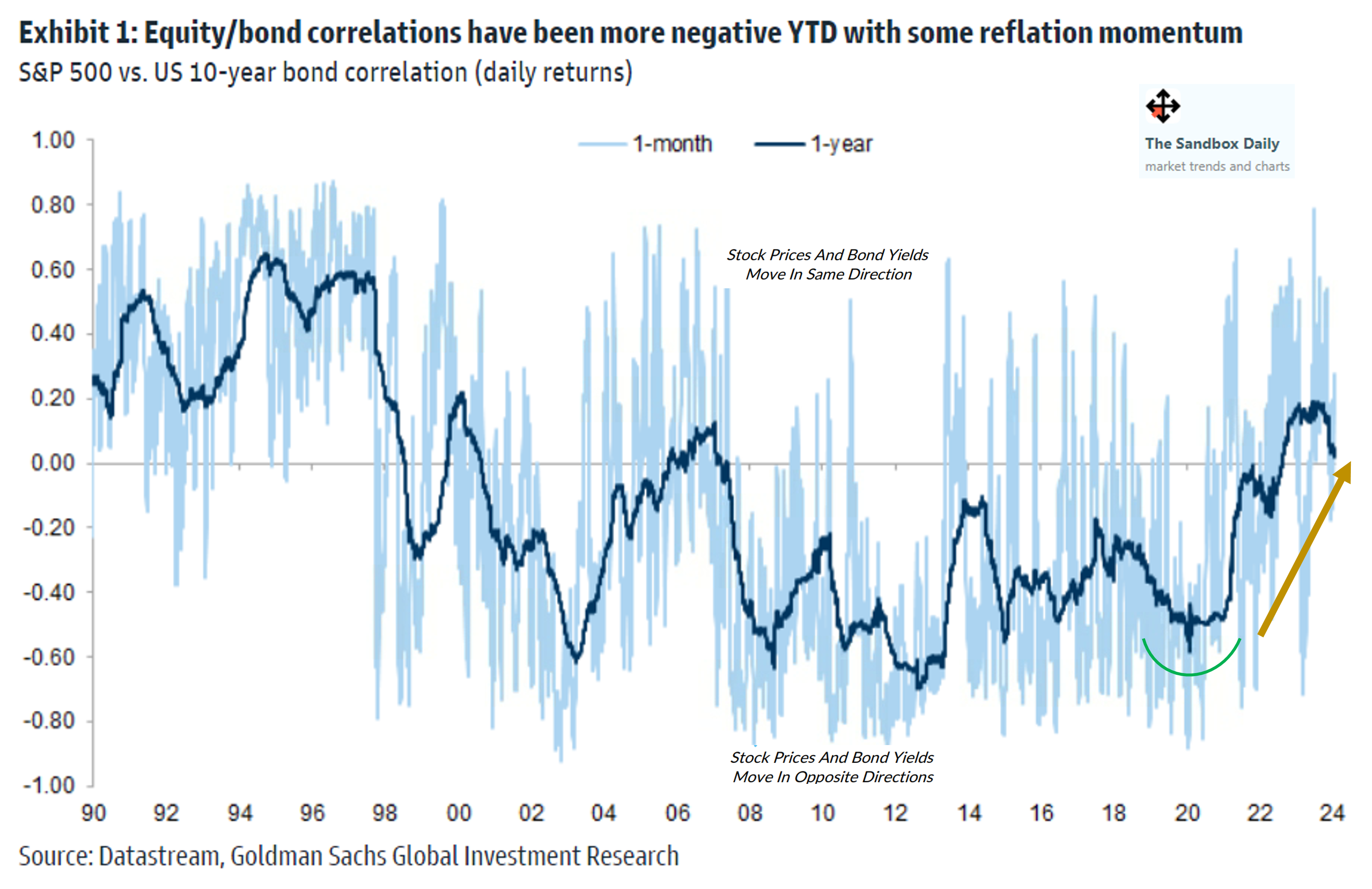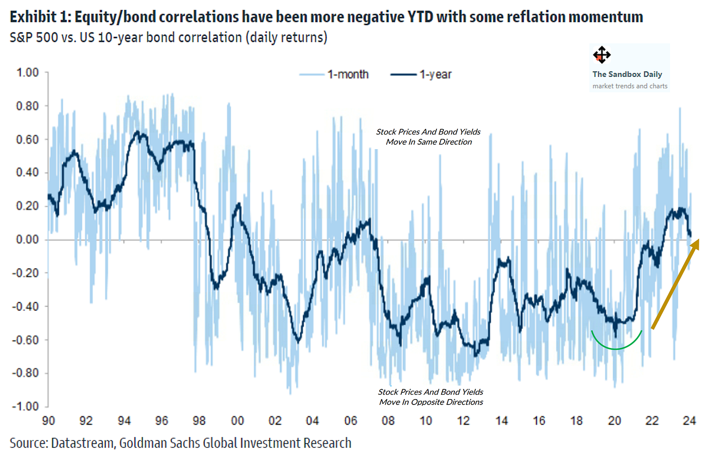 Equity/bond correlations have been rising and are now positive, although that relationship has only started to reverse/weaken.