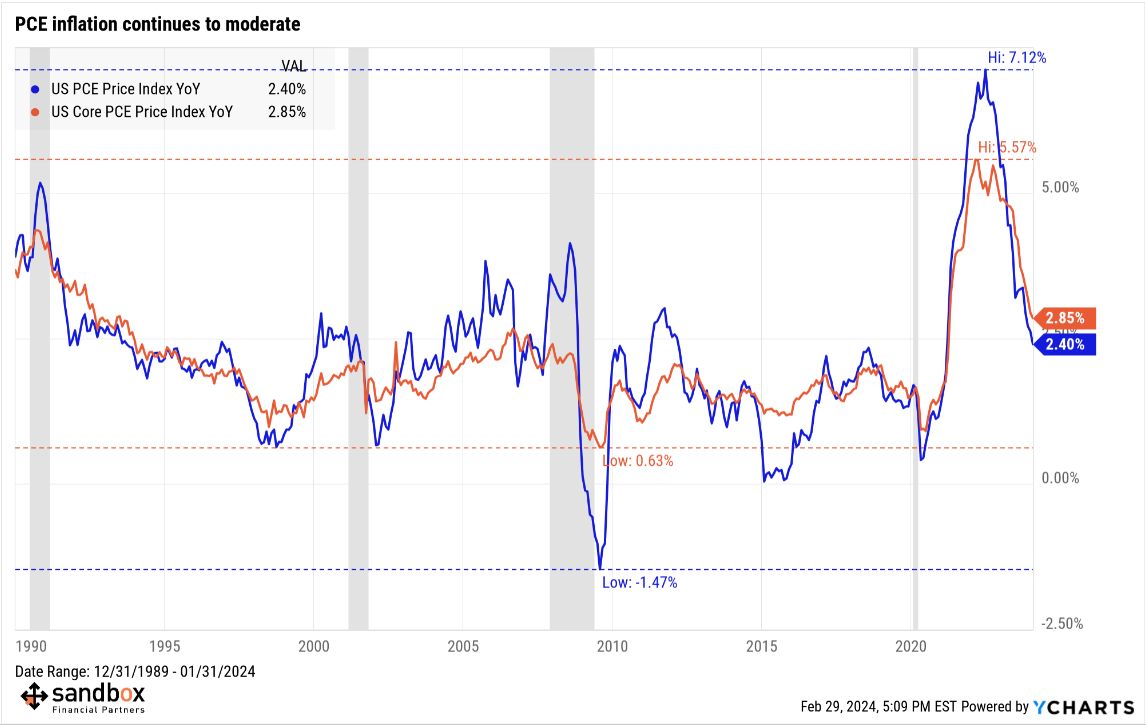 The PCE report today is reassuring because the Consumer Price Index (CPI) and Producer Price Index (PPI) reports for January, which were out earlier this month, were hotter than expected and knocked the stock market around. At the time, we need to see more data because a single month of strength does not make a trend.