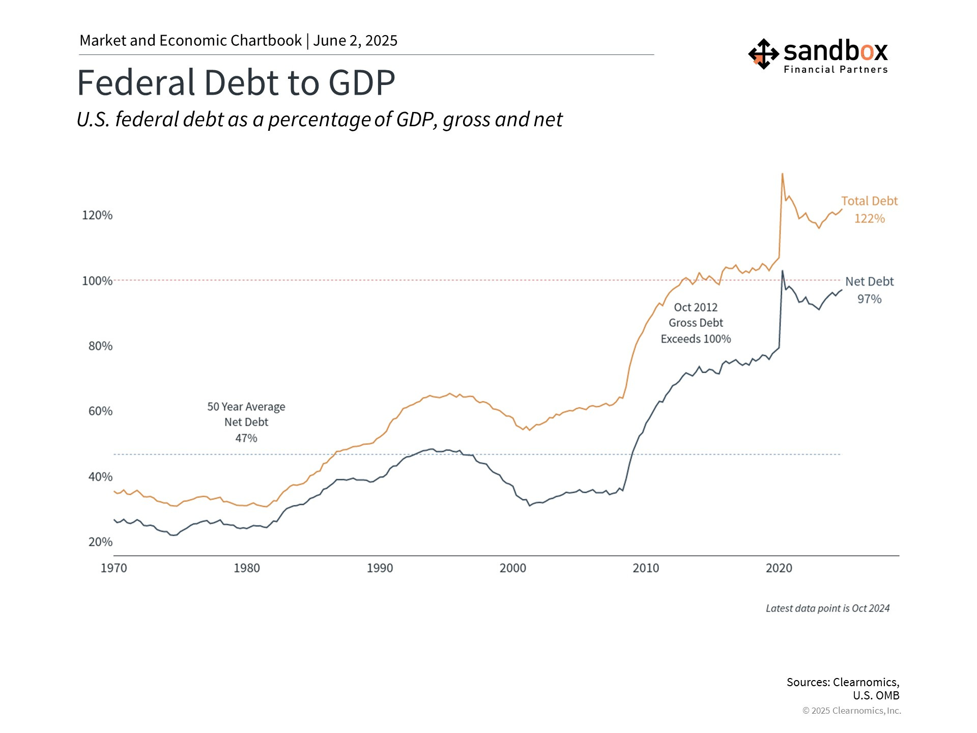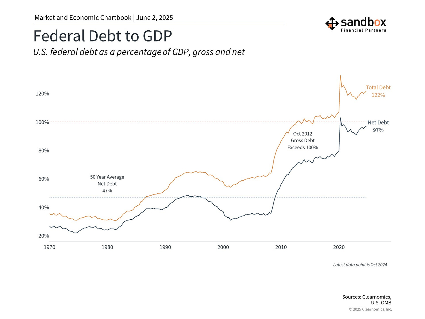 The chart below shows that the U.S. total debt grew to 122% of GDP in 2024. Net debt, which excludes debt the government owes itself, has risen to 97%.