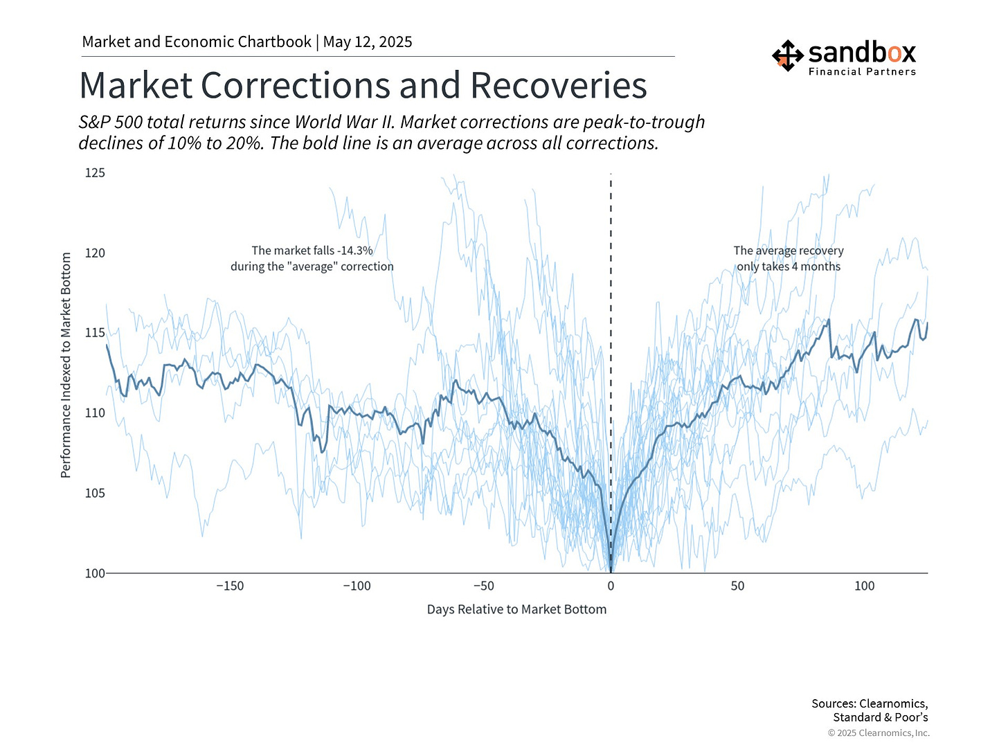 The chart below shows how market corrections have behaved since World War II. While the average correction experiences a decline of 14%, it often recovers in as little as four months.