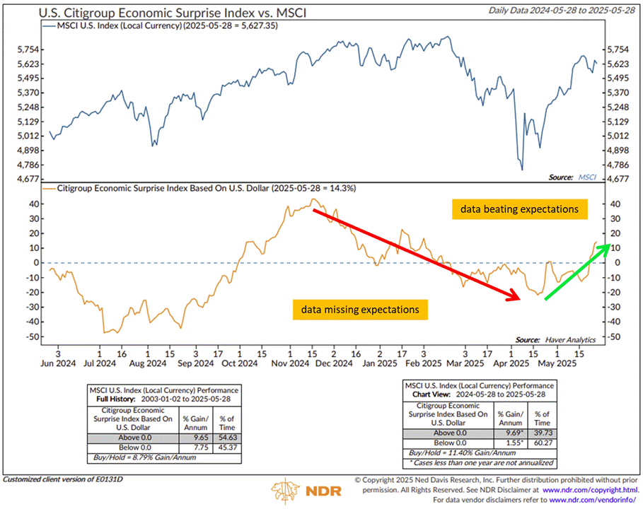 The U.S. Citigroup Economic Surprise Index – a widely followed indicator that provides a quick-and-dirty snapshot of how the economy is faring against expectations – has just risen above the zero line and flipped outright positive for the first time since February.
