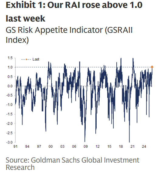 Risk appetite indicators across the street sit firmly in bullish territory, with flows into risky assets continuing to run positive – underscoring how comfortable investors remain leaning into risk even as uncertainty dominates the tape.