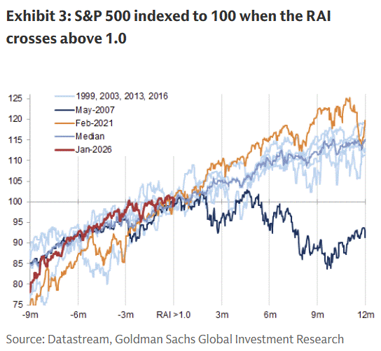 The 98th percentile reading on Goldman's RAI is striking when paired with asset managers' record short VIX positioning. It's the classic "everyone's leaning the same way" setup. What I find most telling isn't the absolute level of confidence but how quickly it rebuilt after recent volatilty spikes. The historical pattern of muted returns 6 months after RAI crosses 1.0 suggests positioning itself becomes the risk, not necessarily fundamentals deteriorating.
