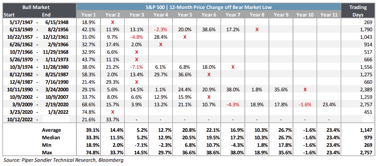The table below highlights the percentage change for each year of a bull market advance post-World War II.