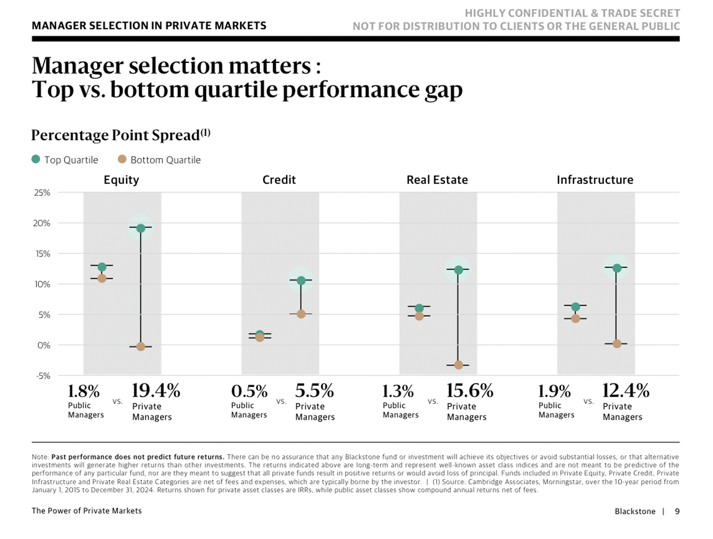 This is illustrated in the Blackstone chart below, which shows the range of outcomes across managers that investors have experienced – in both public markets and private markets. As you can clearly see, the range is much, much wider for private assets (dumbbells, right side) than for public assets (dumbbells, left side).