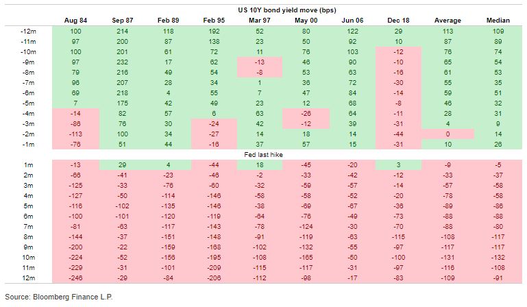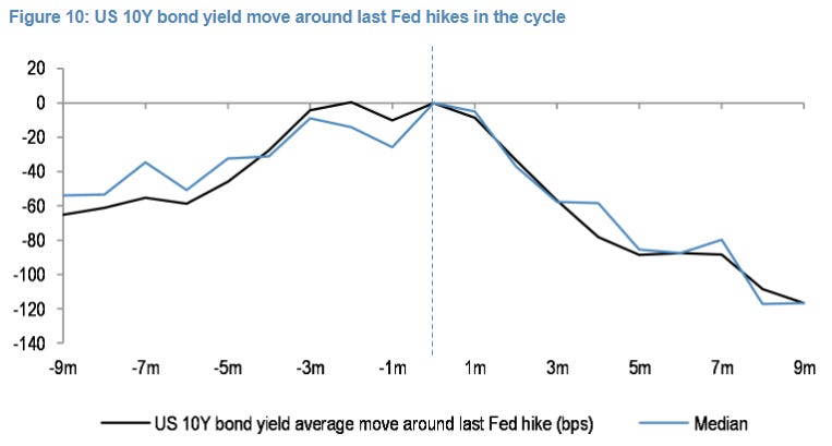 Reviewing these past cycles shows that bond yields always fell rather quickly following that final hike, down over 50 bps after 3 months and 100 bps after 8 months – meaning, the peak for interest rates in the cycle is rather fleeting.