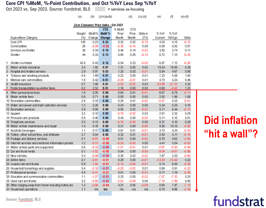 Drilling down, the bigger story seems to be that inflation could be hitting a wall. Just 7 of 31 Core CPI components saw a rise in October. Also key, the shelter fever seems to be breaking.