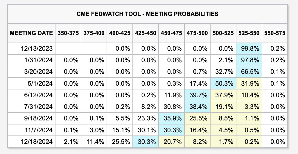 The market now shows a 0% change of additional rate hikes, with rate cuts beginning in May 2024.