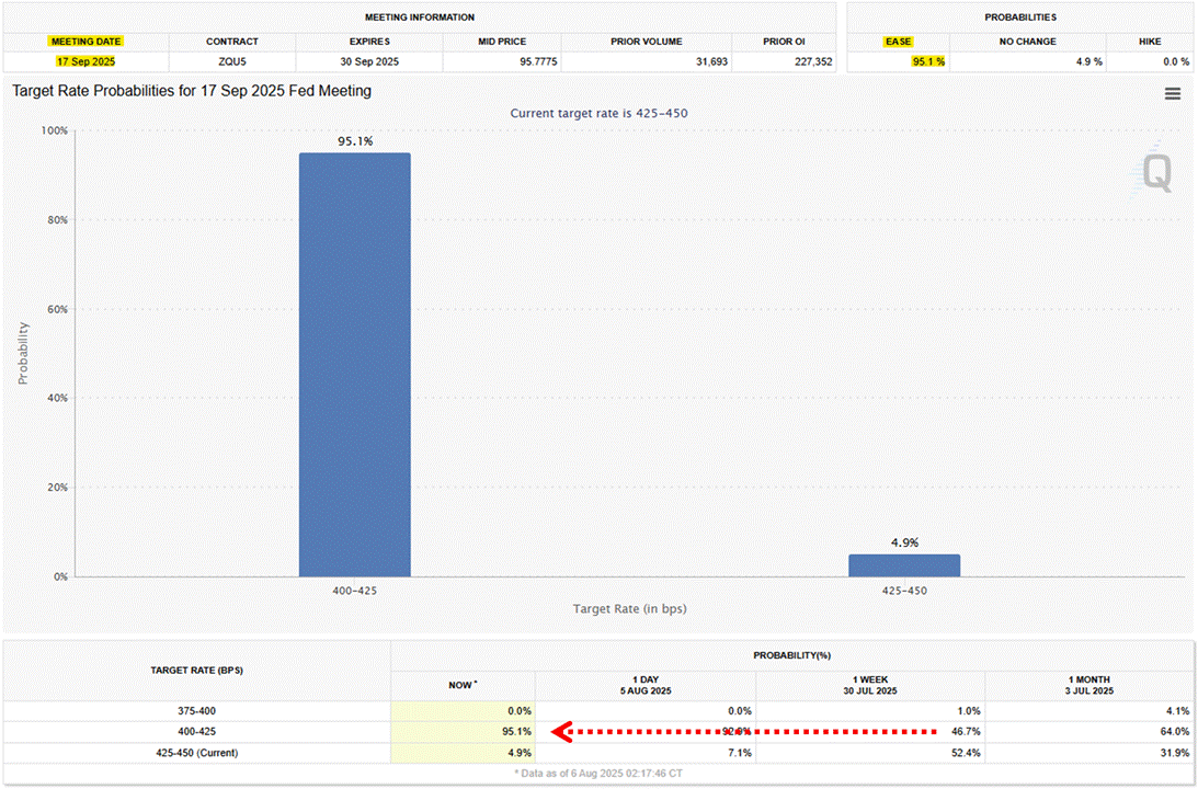 Options data using the CME's FedWatch Tool shows the probability of a September cut surged from a 50-50 proposition (46.7%) to a near certainty (95.1%), while a total of three 25 bp cuts are priced by years-end.