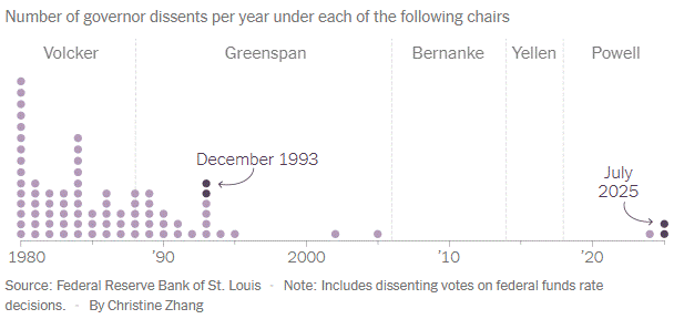 Even dissention among the Fed’s own committee is growing. For the first time since 1993, two governors (Christopher Waller and Michelle Bowman) broke ranks by casting votes against the decision to hold the central bank’s benchmark key rate unchanged, instead preferring to reduce it by a quarter percentage point.