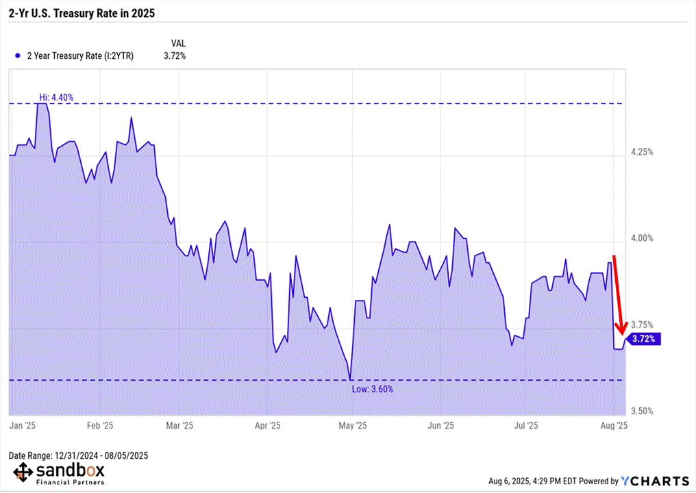 Pricing in the 2-yr U.S. Treasury rate has shifted sharply from the hawkish to the dovish end of the recent range with the market-implied rate trading near the post-Liberation Day lows. For a generally sleepy market, the move on the short-end of the Treasury curve is an abrupt reassessment of the economic outlook.