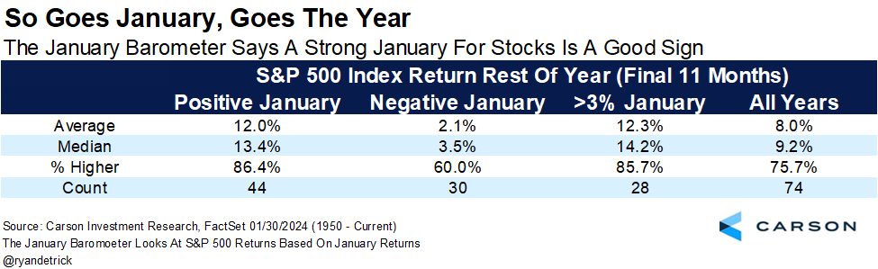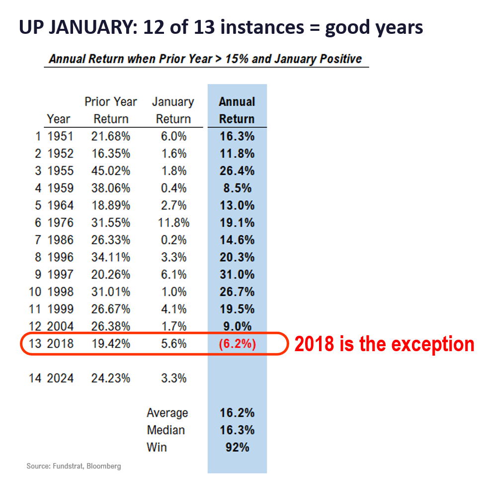 Since 1950, when the prior year’s S&P 500 index return is greater than +15% – like 2023 – and the next January’s monthly return is positive, the full year return averages +16.2% with a success rate of 92%.