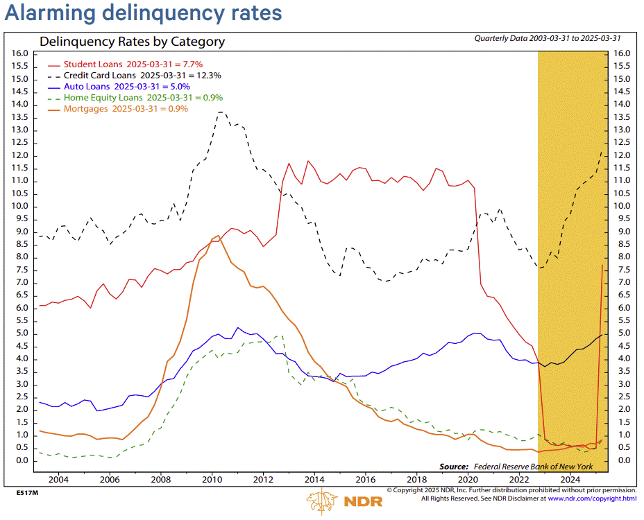 The delinquency rate on student loans has soared to 7.7% (red line below) now that the grace and forgiveness period under the Biden administration has ended.