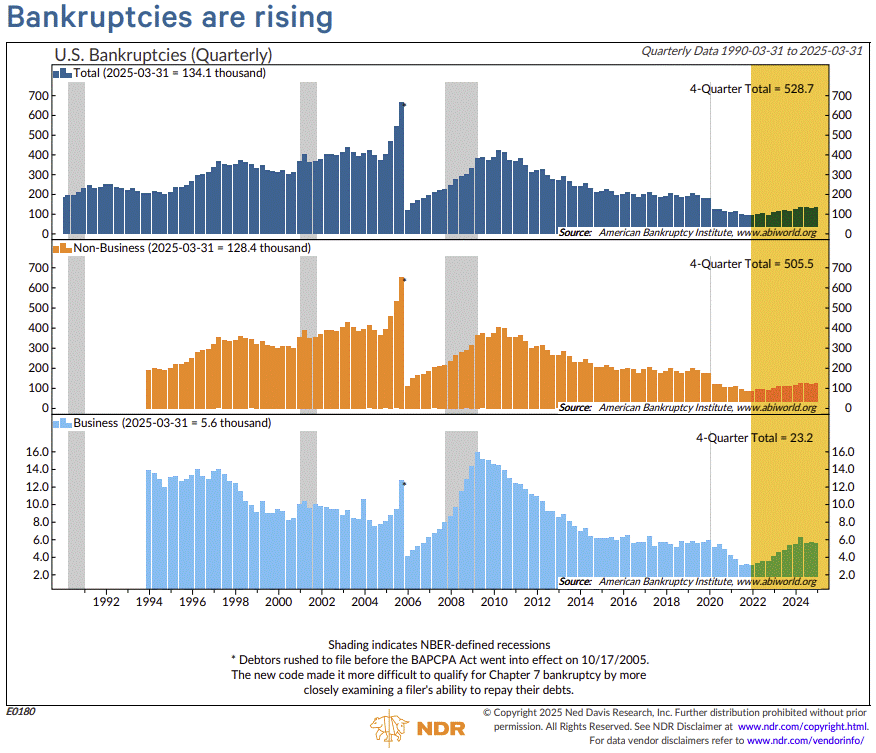 Business and non-business bankruptcies have been rising steadily on a 4-quarter basis.